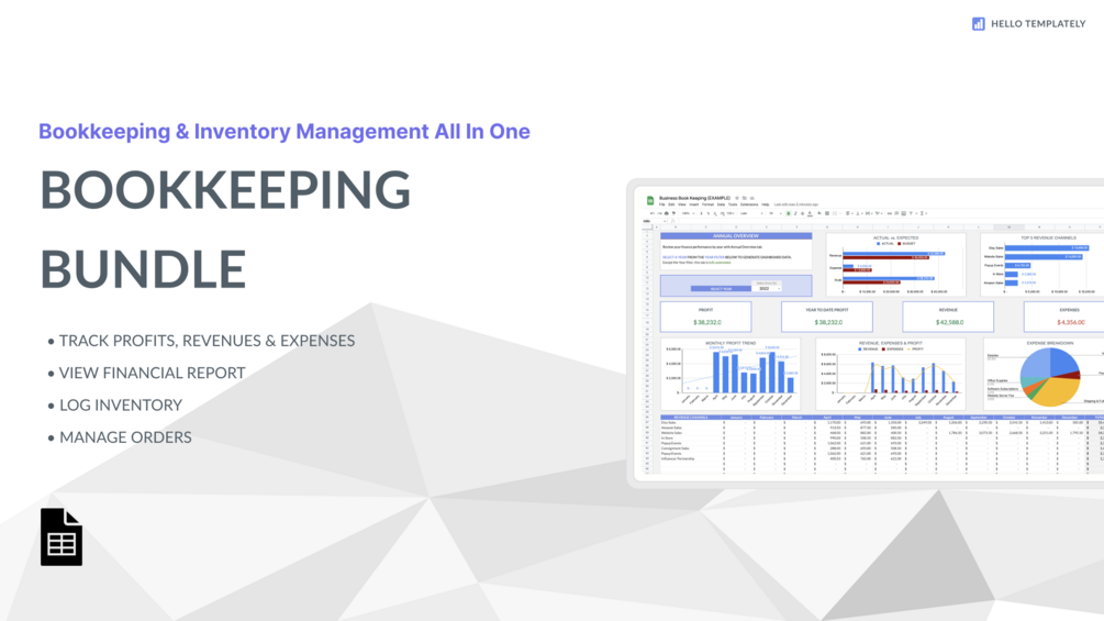 Made for entrepreneurs looking to streamline their finance and grow their business, our Business Bookkeeping Templates Bundle gives you the tools to efficiently track your finance records, manage your inventory operations, and discover insights for better informed business decisions.