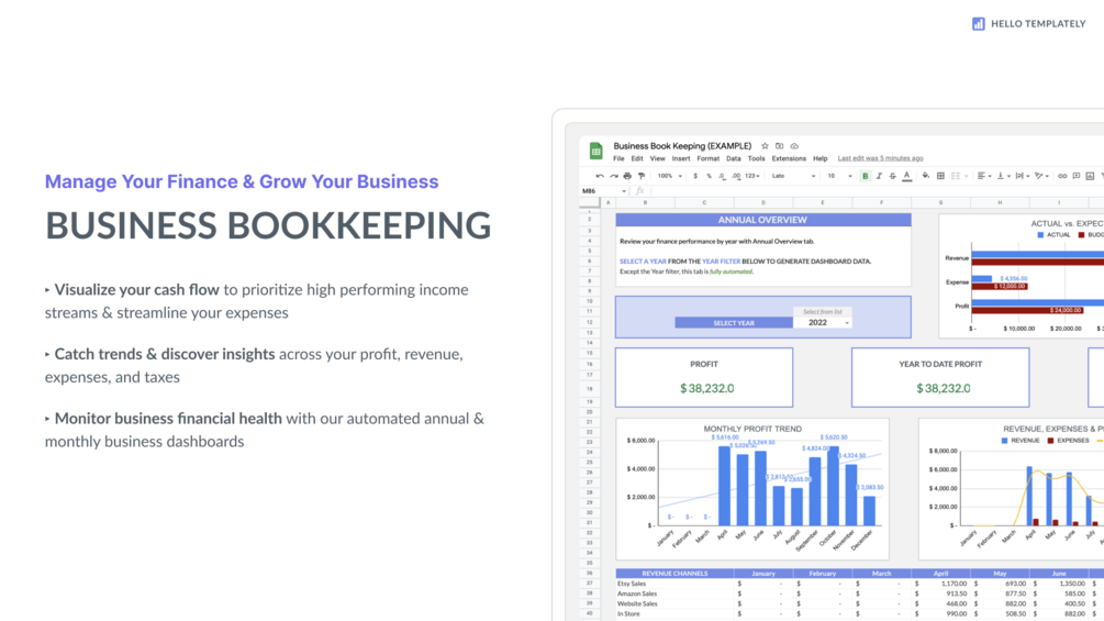 Made for entrepreneurs looking to streamline their finance and grow their business, our Business Bookkeeping Templates Bundle gives you the tools to efficiently track your finance records, manage your inventory operations, and discover insights for better informed business decisions.