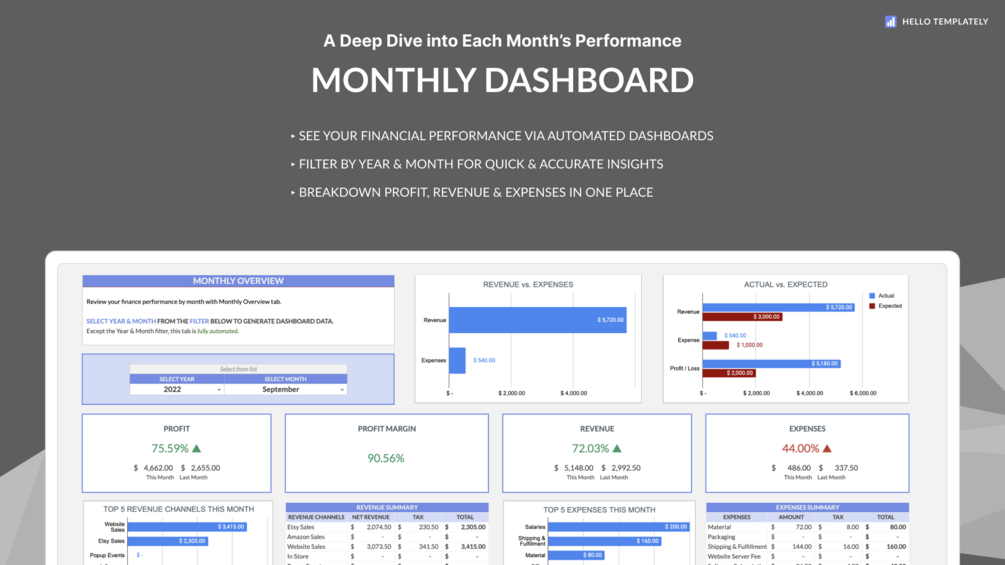 Manage your finances with our automated bookkeeping dashboard that tracks your monthly and annual profits, revenues and expenses.