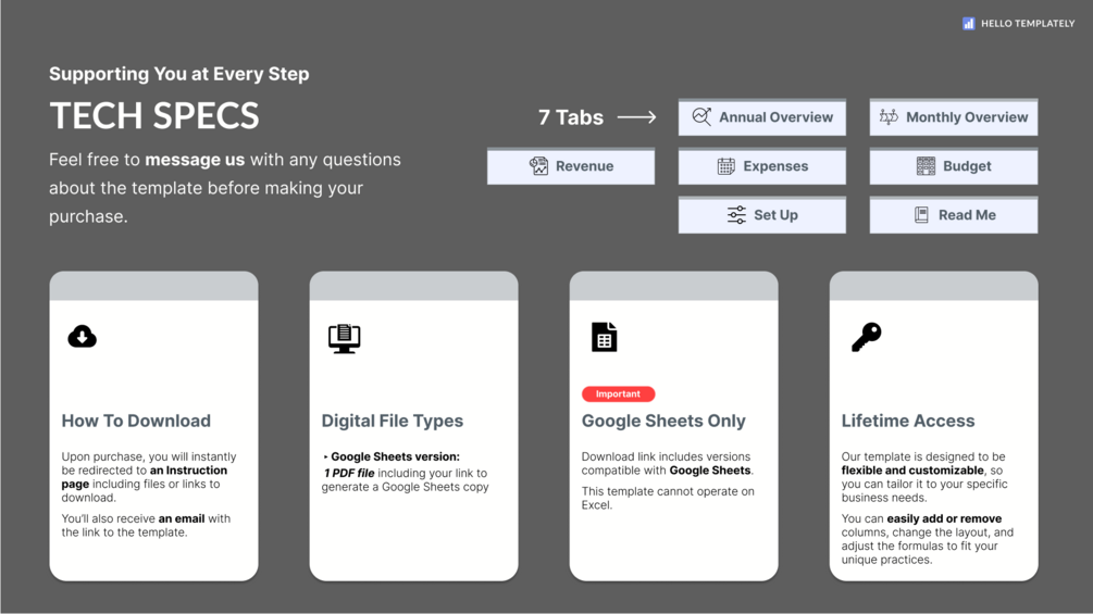 Upon purchase, you will instantly be redirected to an Instruction page including a PDF file containing your template download link (if you purchase an Excel version) or a link to generate a template copy (if you purchase a Google Sheet version). You’ll also receive an email with the link to the template.