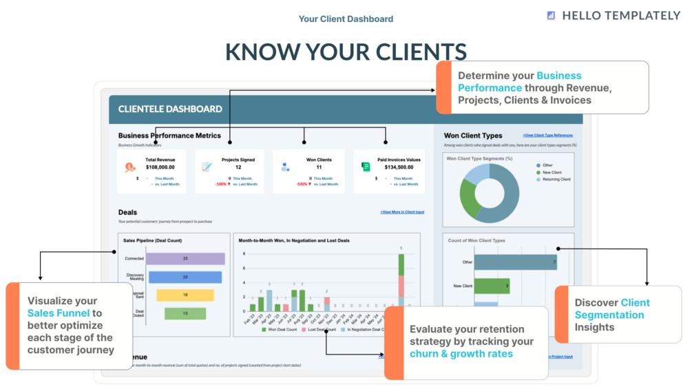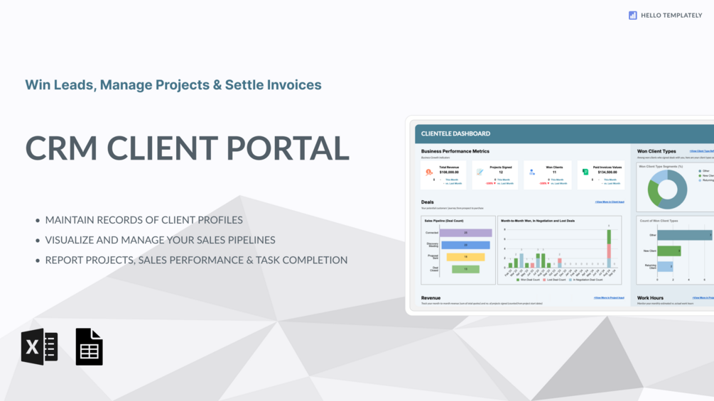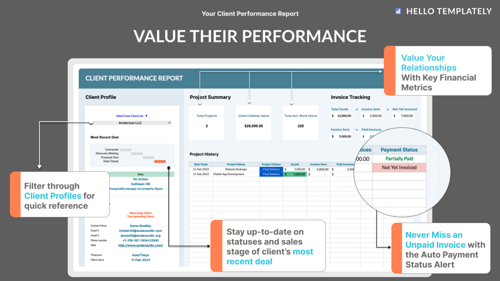 This template offers a comprehensive solution for organizing client profiles, tracking projects, manage invoices, and optimizing customer relationship management processes. With its intuitive design and customizable features, the Client Tracker template is your go-to resource for enhancing client engagement and driving business growth.