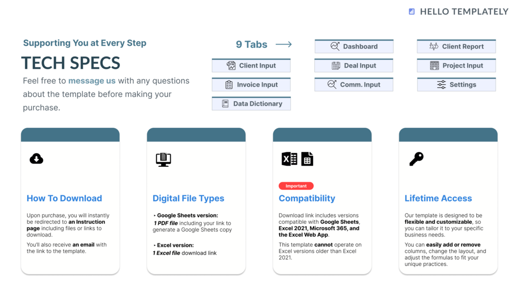 Upon purchase, you will instantly be redirected to an Instruction page including a PDF file containing your template download link (if you purchase an Excel version) or a link to generate a template copy (if you purchase a Google Sheet version). You’ll also receive an email with the link to the template.