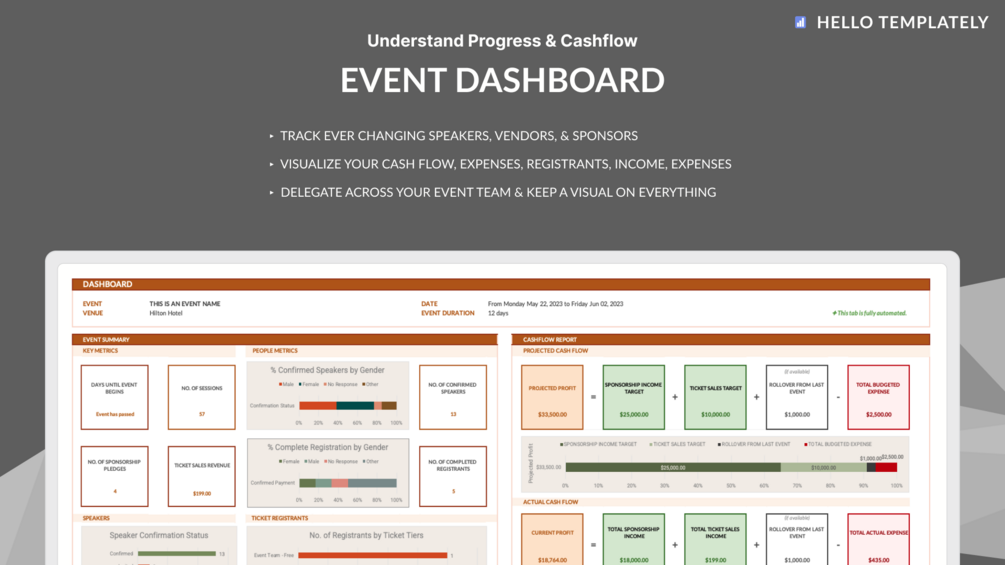 This sheet tracks important details and deadlines such as registrant revenue, vendor agreements, expense breakdowns, and sponsorship targets reached. It allows you to collaborate with your entire event team in real-time, allowing you to delegate responsibilities while maintaining a visual on all that is going on.