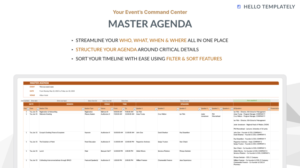 Our Event Planner template is the ultimate tool for organizing and streamlining your agenda, speakers, sponsors, vendors, and registrants. This spreadsheet was crafted by event management consultants experienced in training seminars and large specific-purpose conferences.
