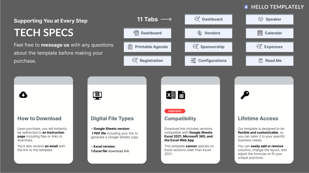 Our lived experience managing hundreds of registrants and speakers is baked into the template's logic. Not only does it track your progress, but it encourages you to structure your event management on the important details that make an event truly memorable.