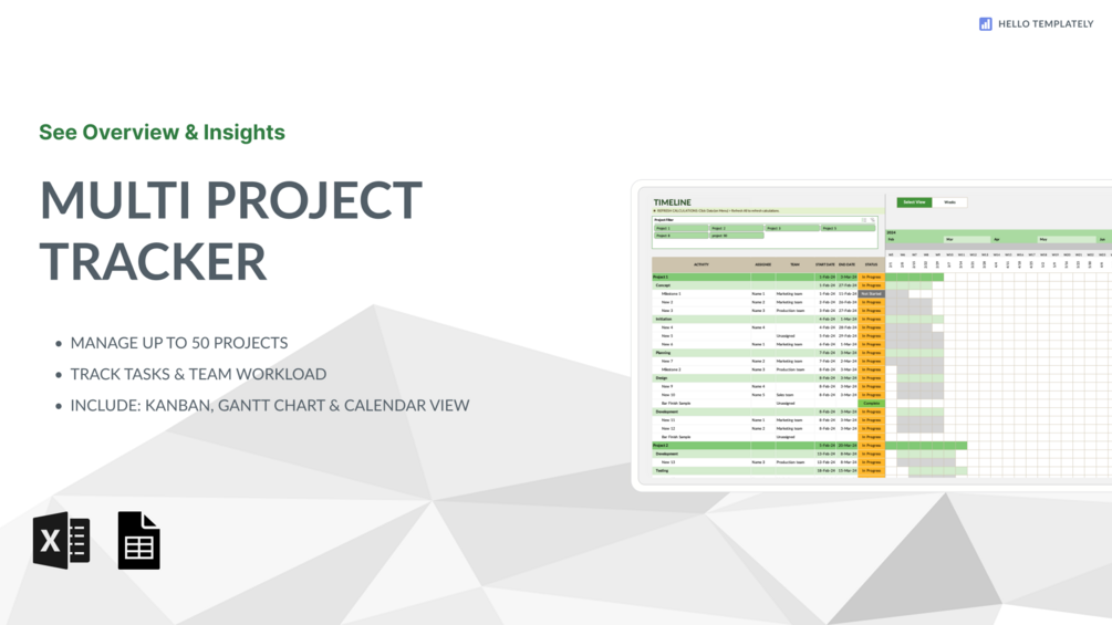 Our project management template in Google Sheets and Excel offers a comprehensive solution for organizing, tracking and completing your projects efficiently.