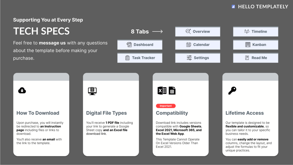 Upon purchase, you will instantly be redirected to an Instruction page including a PDF file containing your template download link (if you purchase an Excel version) or a link to generate a template copy (if you purchase a Google Sheet version). You’ll also receive an email with the link to the template.