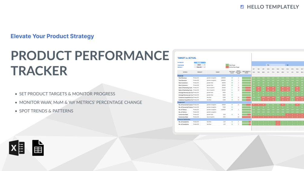 The Product Performance Tracker template is a perfect tool for product managers, business owners, team leaders, data analysts, development teams, tracking up to 50 metric categories, 50 metrics & 50 products.