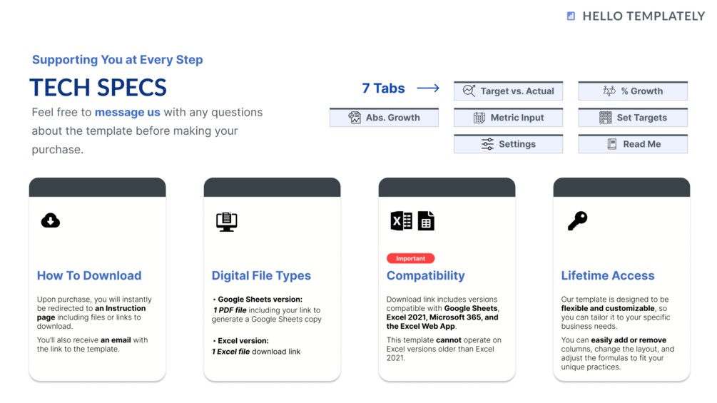 Upon purchase, you will instantly be redirected to an Instruction page including a PDF file containing your template download link (if you purchase an Excel version) or a link to generate a template copy (if you purchase a Google Sheet version). You’ll also receive an email with the link to the template.