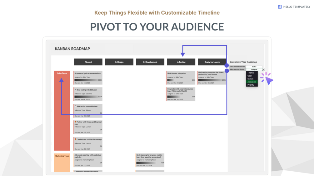 Our Product Roadmap template instantly creates responsive Timelines & Kanban roadmaps to align teams, stakeholders, and customers around a product’s goals.