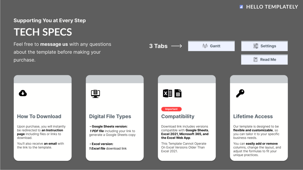 Upon purchase, you will instantly be redirected to an Instruction page including a PDF file containing your template download link (if you purchase an Excel version) or a link to generate a template copy (if you purchase a Google Sheet version). You’ll also receive an email with the link to the template.